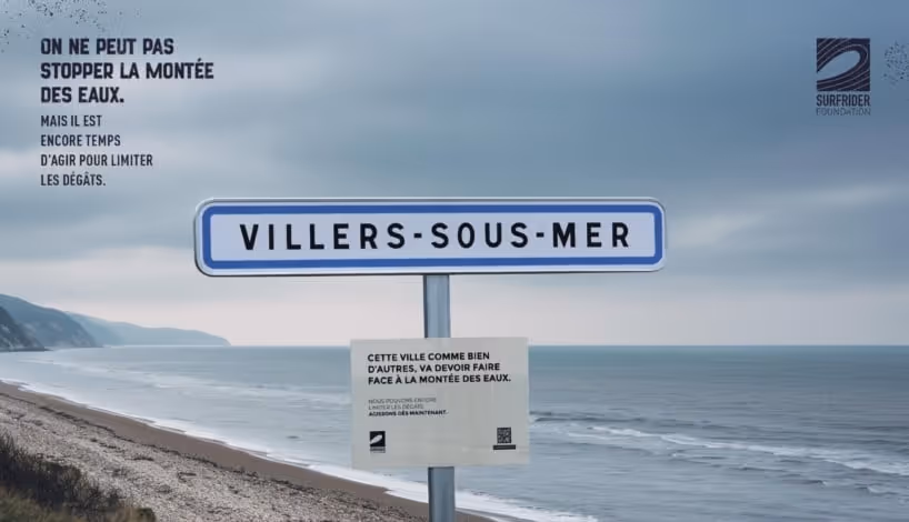 Conséquence directe du réchauffement climatique et de la fonte des glaciers, la montée des eaux s’accélère. Aujourd’hui en France, c’est 20 % du trait de côte qui est en recul et 30 km² de terres perdues en 50 ans. Alors, la Fondation Surfrider a lancé une campagne de communication pour alerter le grand public et changer les comportements. L’idée ? Renommer les premières communes potentiellement victimes de l’élévation du niveau des océans telles que Villers-sur-Mer, Boulogne-sur-Mer, Trouville-sur-Mer en « -sous-mer ». Trois petites lettres qui changent et c’est tout l’imaginaire que l’on projette sur ces communes qui évolue lui aussi, laissant alors deviner un avenir assez sombre, voire apocalyptique.
