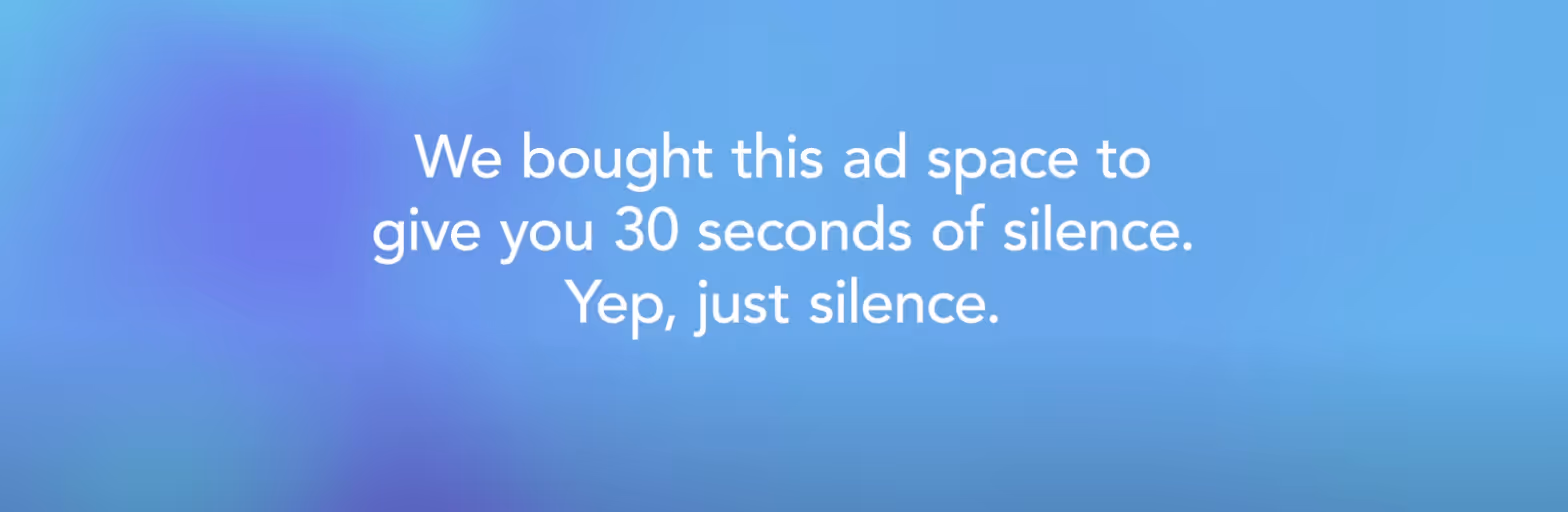 Et si la meilleure façon de communiquer, c’était de se taire ? C’est en tout cas la stratégie de l’application de méditation Calm. On vous dresse le tableau, Mardi 5 novembre, pleine soirée des élections américaines, les chaines d’infos à gogo, le débit de parole à cent à l’heure, et, parmi tout ce tumulte, une page de pub muette & un simple message écrit : « We bought this ad space to give you 30 second of silence. Yep just silence. ». Un calmant marquant.
